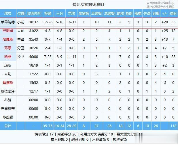 快船:莱昂纳德55分11板2助5断3帽、哈登28分4板7助、巴图姆12分4板1助、洛佩斯7分7板2助2断、邓恩5分1板3助2断、琼斯3分3板、尼德豪泽2分2板、米勒3板1助、桑德斯2助